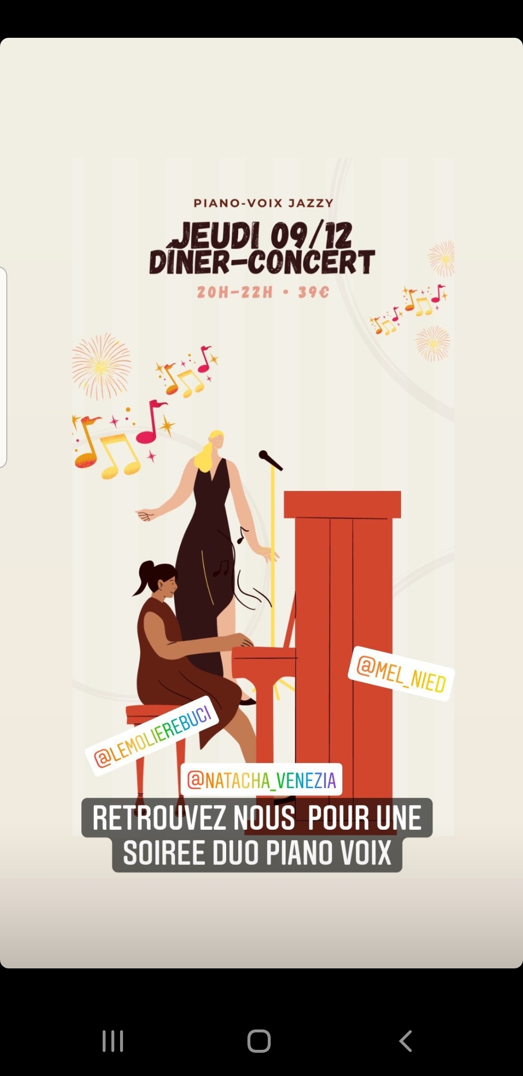 RDV le jeudi 9 décembre à 20h à l'étage du restaurant le Molière pour dîner avec un concert piano-voix 🎹